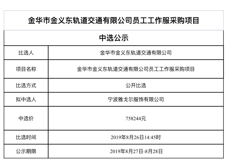 金華市軌道交通控股集團(tuán)物業(yè)管理服務(wù)有限公司2025-2026年度勞務(wù)派遣人員工作服采購項(xiàng)目中標(biāo)候選人公示